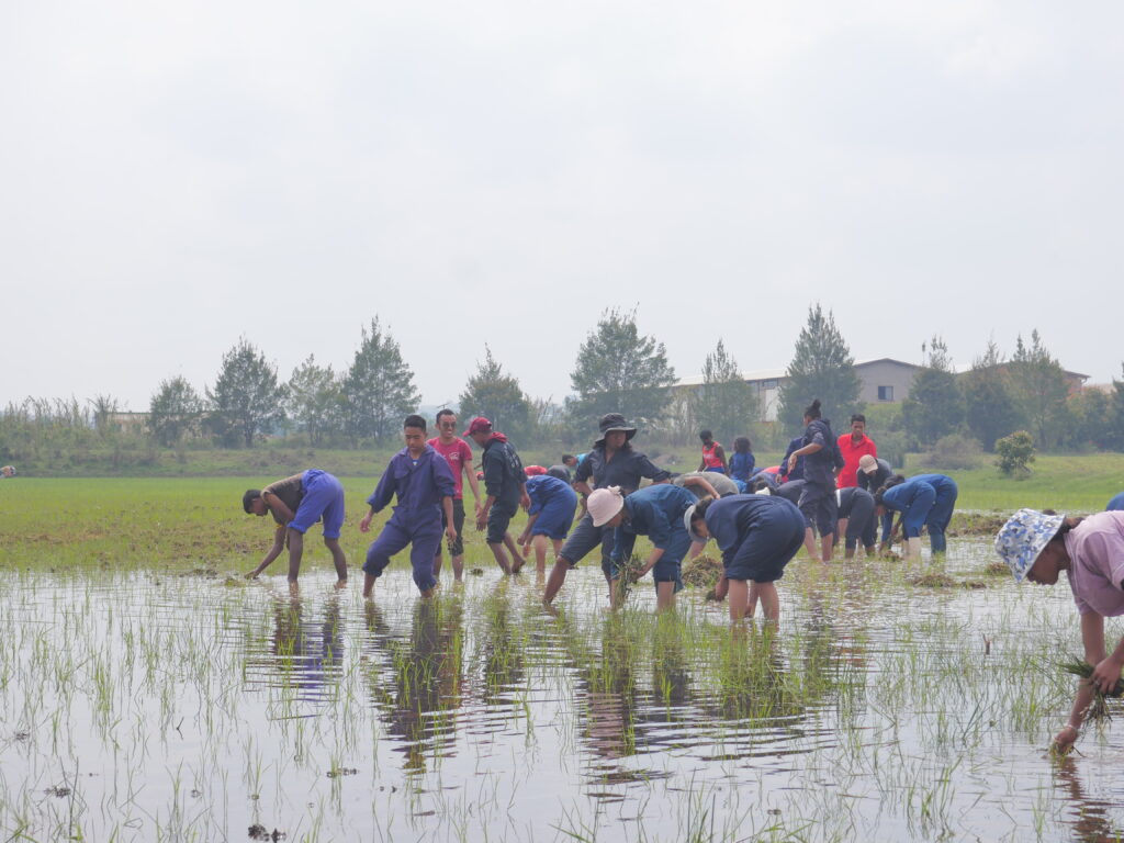 Legende sary: Sur ces photos, on voit les étudiants en L1 enlevant les mauvaises herbes qui empêchent la pousse du riz.