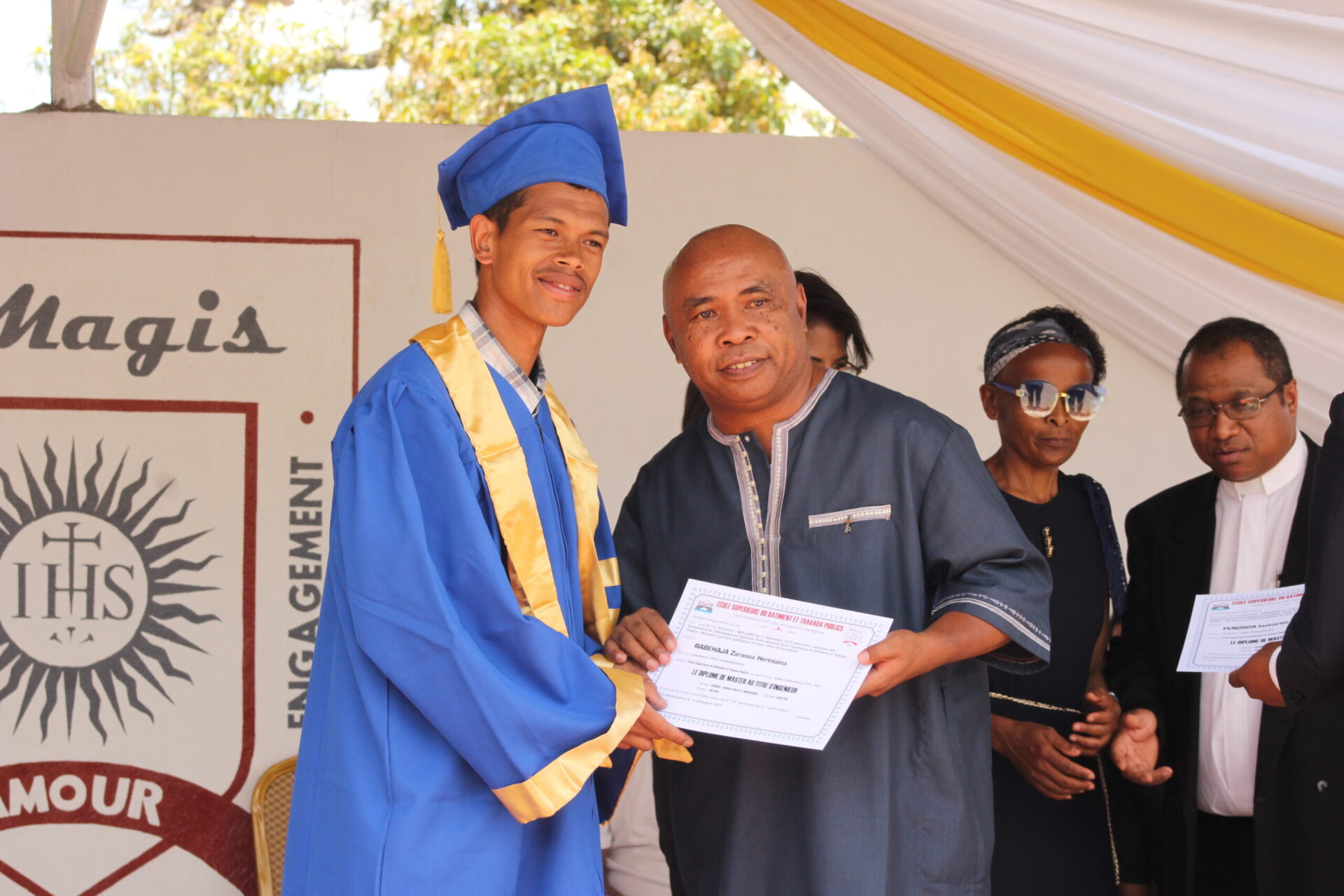 La cérémonie a débuté par une messe de remerciement à Dieu pour cette bénédiction. La remise de diplôme a été précédée par la prise de parole du président de l’U-Magis et du père provincial de la compagnie de Jésus à Madagascar. Lors de son discours le père directeur de l’U-Magis Bevalala et président de l’U-Magis Madagascar a félicité la promotion IRAY pour leur remise de diplôme, il a aussi donné un avant-goût des prochains changements dans l’U-Magis Madagascar prochainement comme le regroupement des écoles techniques de l’U-Magis en polytechnique comme le ETS, l’ESBTP, ITSFX, et les écoles de sciences humaines en école de sciences humaines comme la SAMIS-ESIC et le PSP . Il a bien précisé qu’un étudiant sortant d’une école jésuite, surtout de l’U-Magis, doit briller sur ceux qui les entourent, toujours porter le slogan : compétence, engagement et amour dans tout ce que l’on entreprend, n’embarrasse pas l’école.